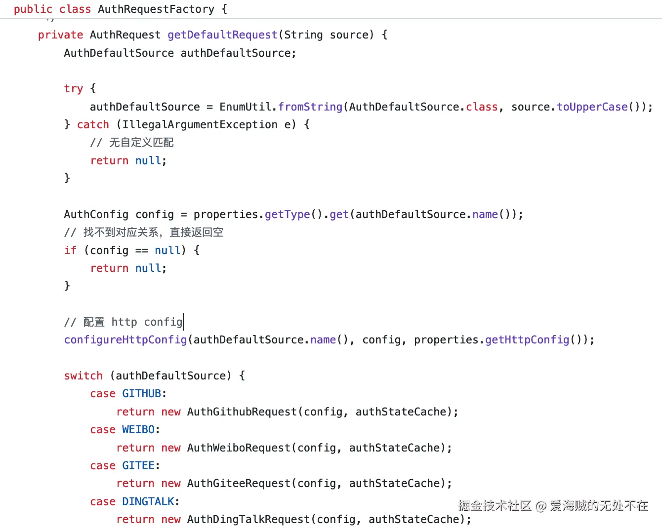 这样对于JustAuth的底层源码和设计,我们就非常快速的找到了核心的操作类,此时是不需要知道具体的底层代码是如何写的,我们只需要关注流程和主线。这个方法中,根据具体的第三方登录的类型,从枚举和配置中活了具体的配置,从而获得了具体的第三方登录请求的实现类,可以看到这是一个典型的策略模式的设计场景,后续再具体学习的时候,可以关注一下设计结构。