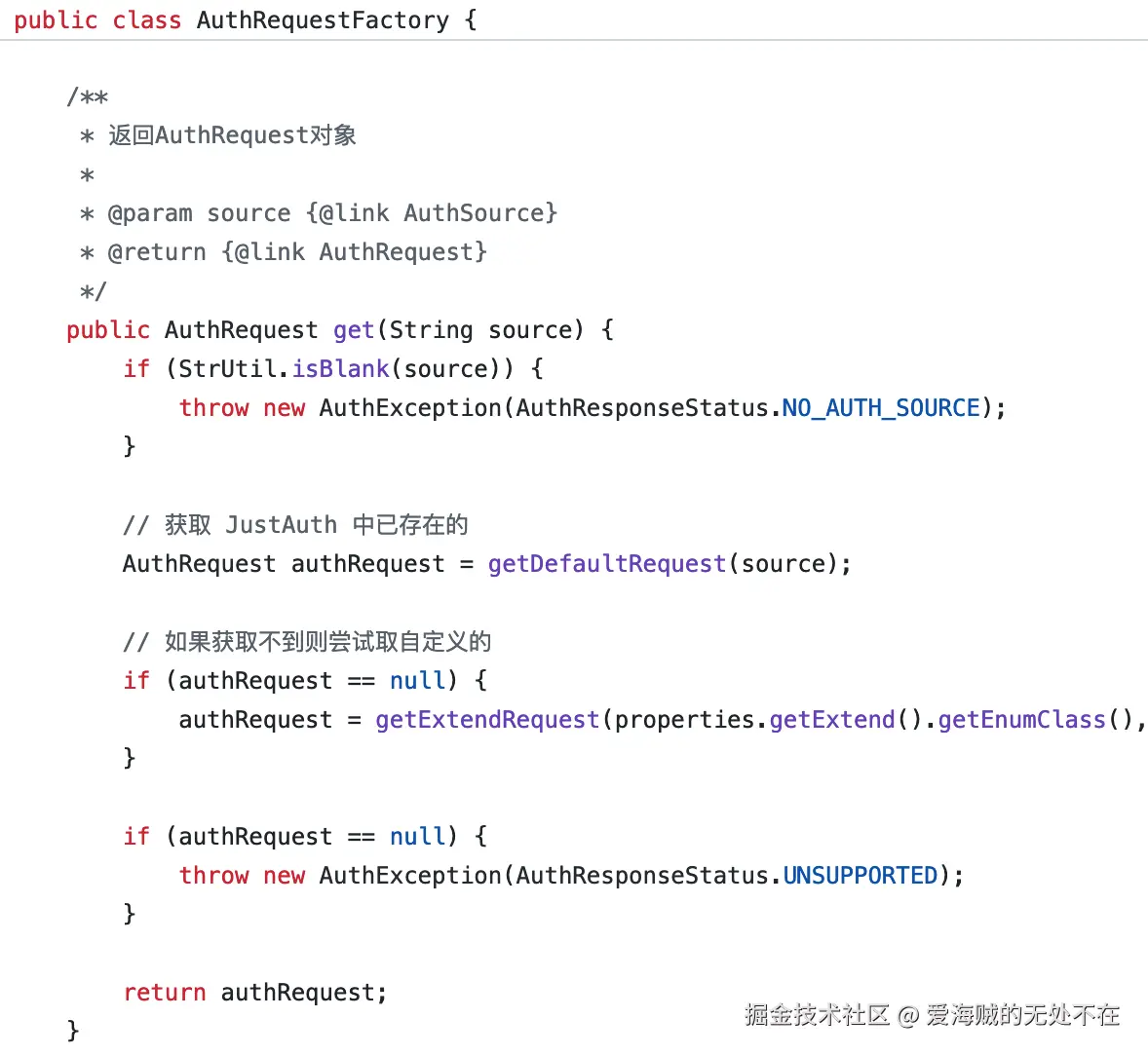 4、找到工厂类中的如下的get方法,代码如下所示,可以看到它先从内置的Default方法中获取下是否存在第三方登录请求处理实现类,不存在再去找自定义扩展的授权请求,还不存在则进行报错: