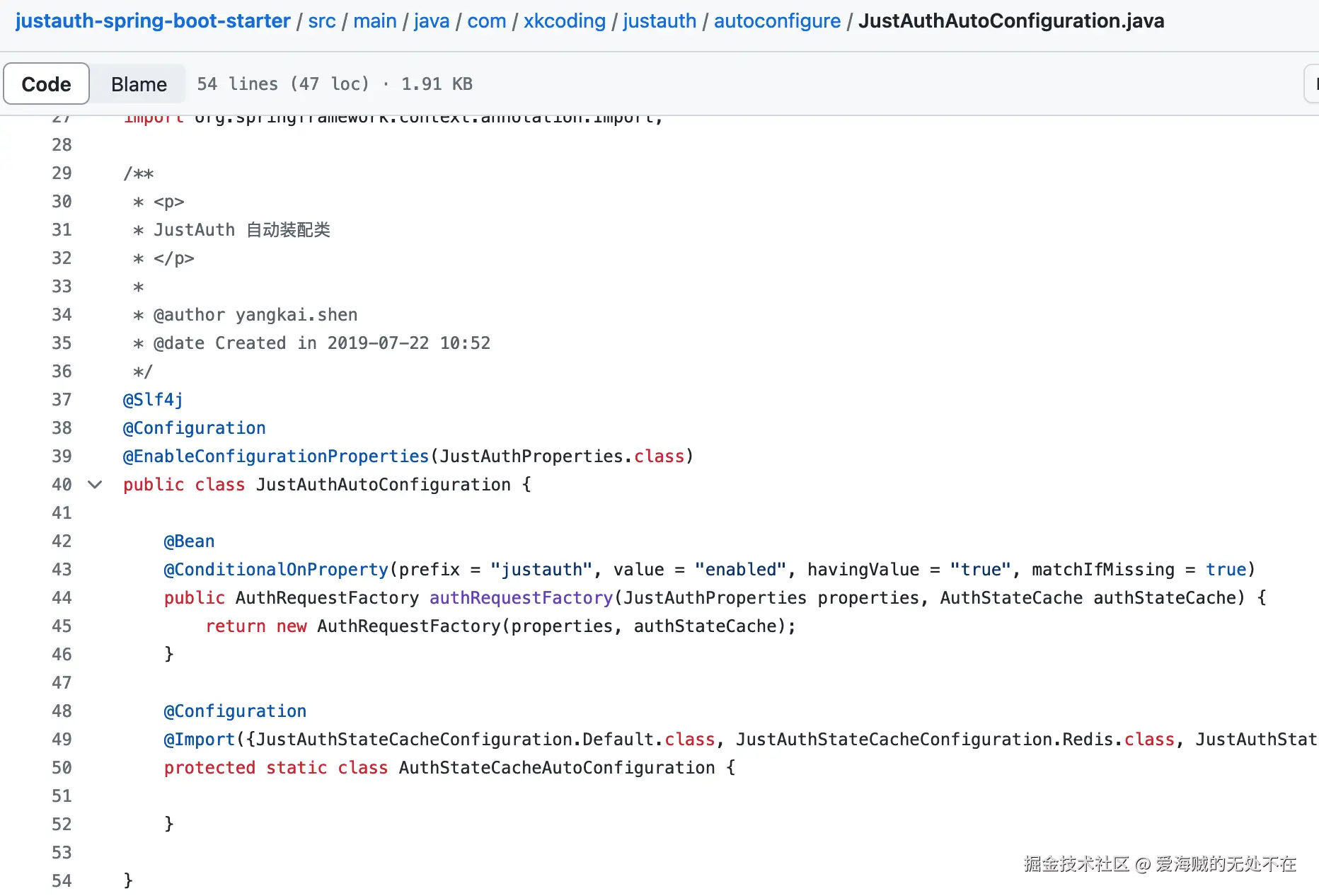 可以非常清晰的看到,启动类为JustAuthAutoConfiguration,我们再看下这个类的源码做了哪些事情:
