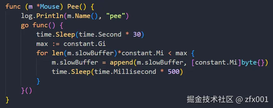 可以看到Run这个方法,虽然一次申请的内存很小,但它却一直在不断的申请,所有我们把它注释掉。而Pee这个方法在30秒后开始1M的申请内存,申请到1G,也是把它注释掉。