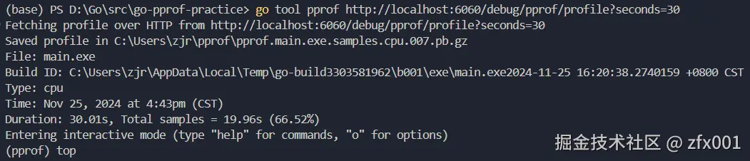 go tool pprof http://localhost:6060/debug/pprof/profile?seconds=30
