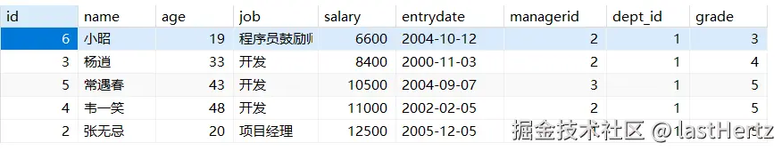 (6, '小昭', 19, '程序员鼓励师',6600, '2004-10-12', 2,1),