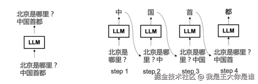 LLM 的推理模式是真正的自回归,预测出下一个单词之后,当作下一步输入再预测下下一个单词。