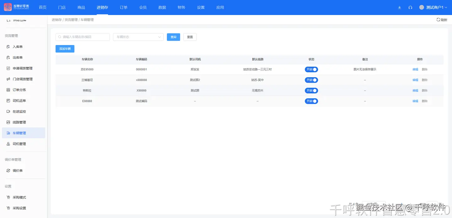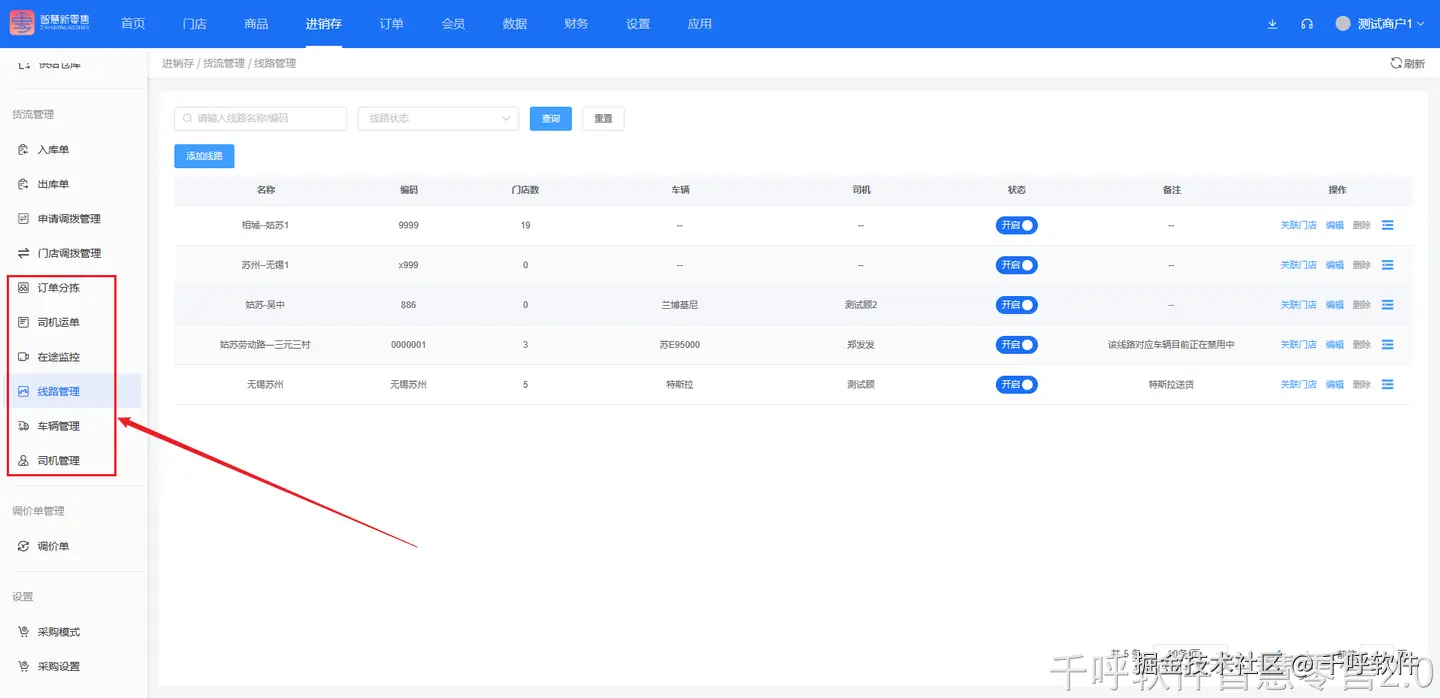 1.连锁店总部开启分拣配送功能后,进销存模块将会展示,有关“分拣配送”插件的功能模块:订单分拣,司机运单,在途监控,线路管理,车辆管理,司机管理。