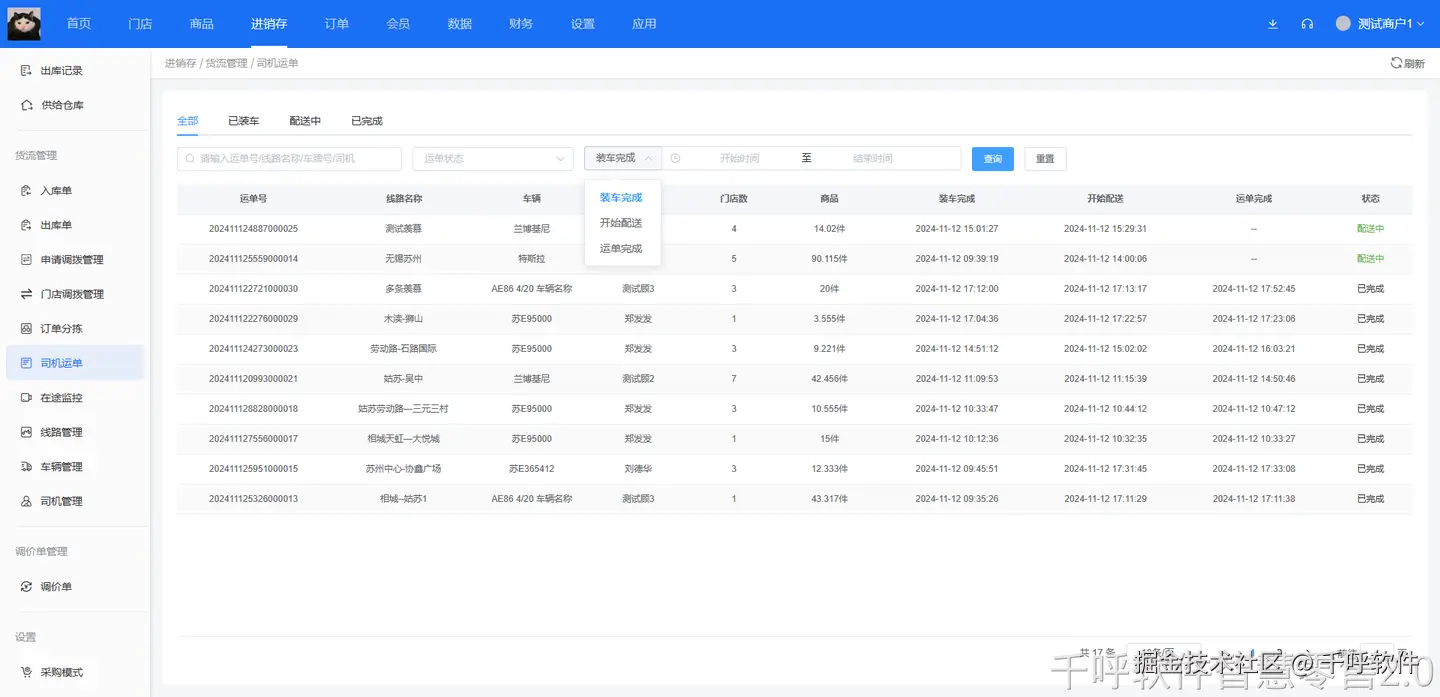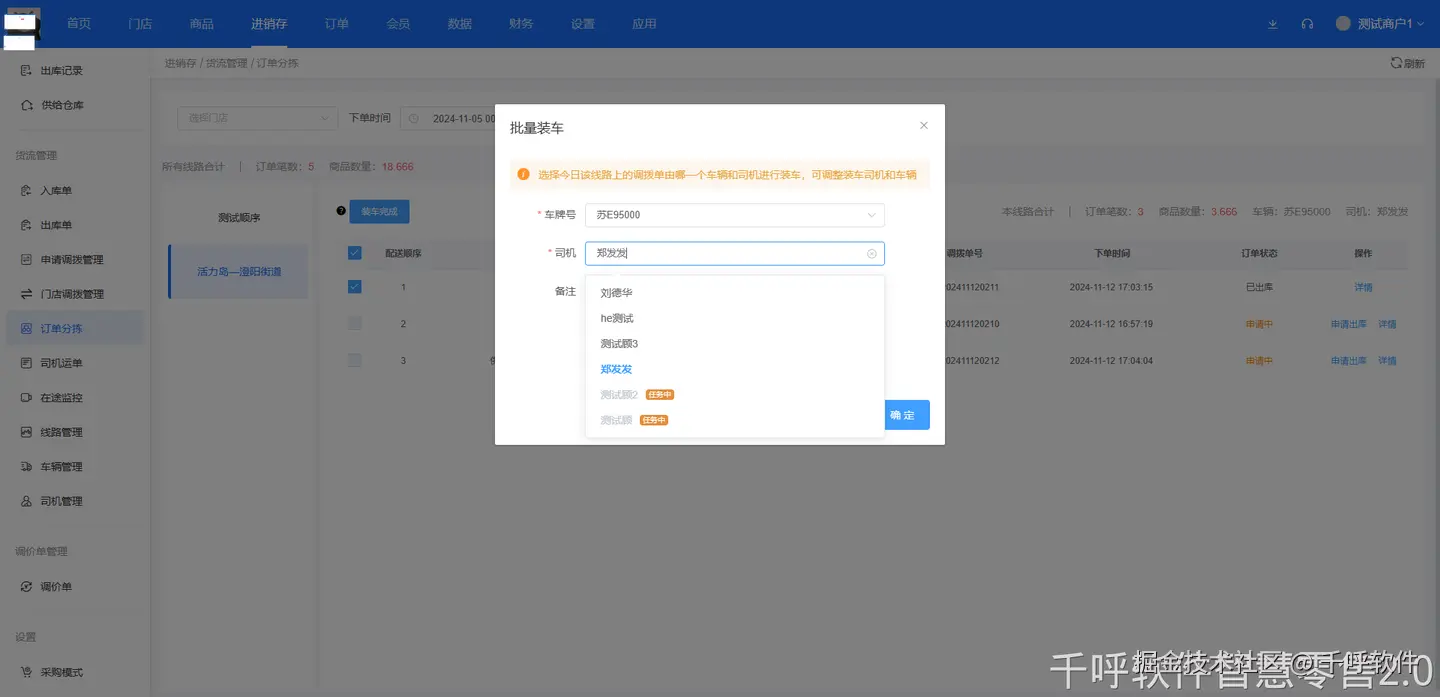 3.线路关联门店后,门店所申请的调拨单商户可通过订单分拣中的批量装车功能形成运单派送给司机,且任务的派送通过“批量装车”功能可临时修改派送的司机和车辆。