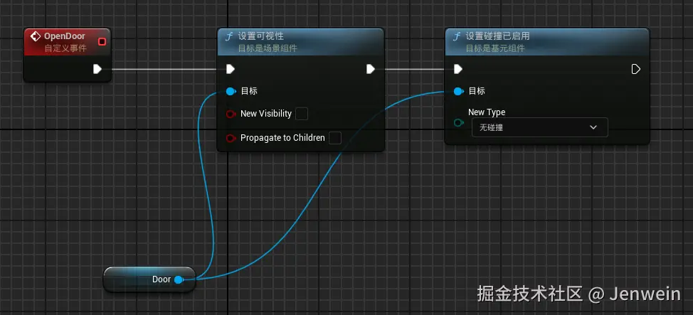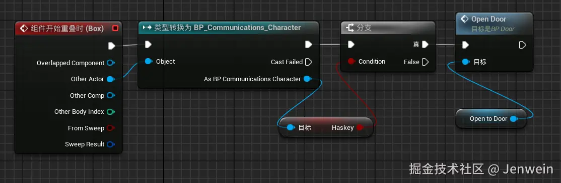 所以这里有一个类型转换Cast To ,将触发的other actor转换为这里的具体的player类型,如果转换成功,那么就是角色,打开门,否则表示出发的不是角色类。