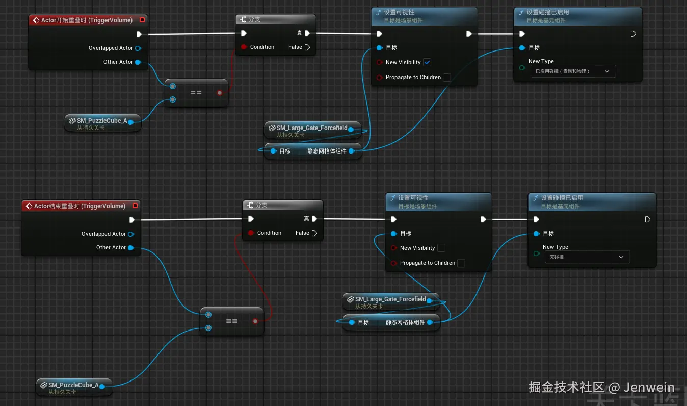 根据逻辑,与触发体积开始重叠的是紫色方块时,branch为true,那么就“关门”,