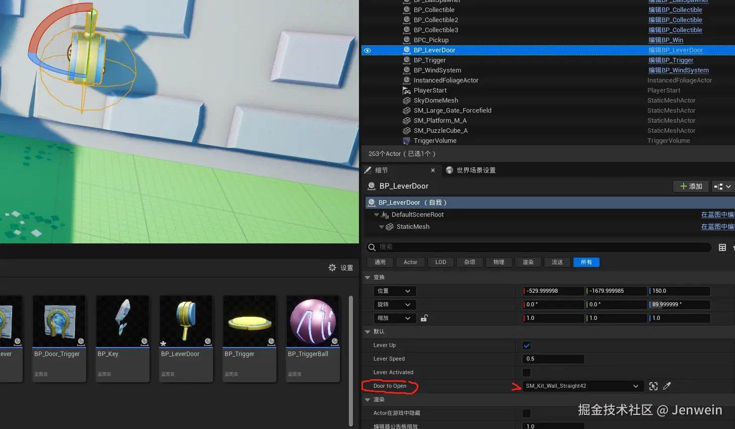 这里添加BP Door lever这个门的对象引用到lever中后,要指定是哪个具体的对象实例。
