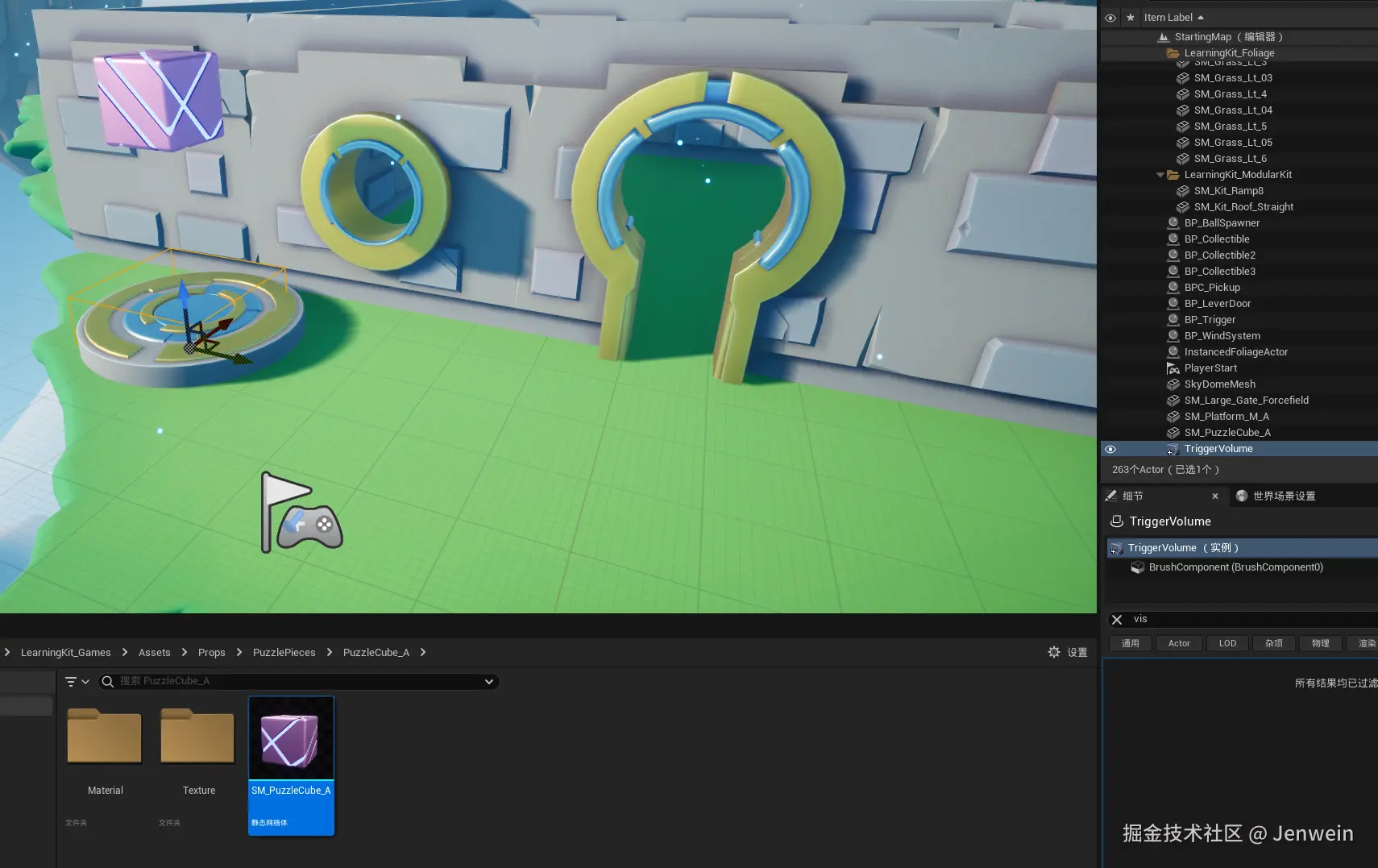 当开始重叠时,下面的Overlapped Actor表示被重叠的Actor,即触发体积本身,Other Actor即为进入触发体积Actor,与触发体积Actor发生重叠的Actor,即为图中的紫色方块。