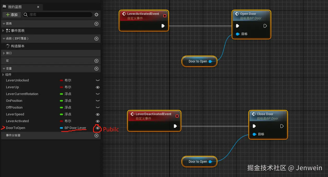 两个没有直接关系的蓝图之间要进行通信,可以考虑面向对象中的组合继承,比如有一个拉杆和一个门,拉杆的两个状态(激活/停用)想要分别调用门的Open和Close,因为拉杆是负责触发的一方,需要调用门的接口,而门并不需要知道触发的逻辑。