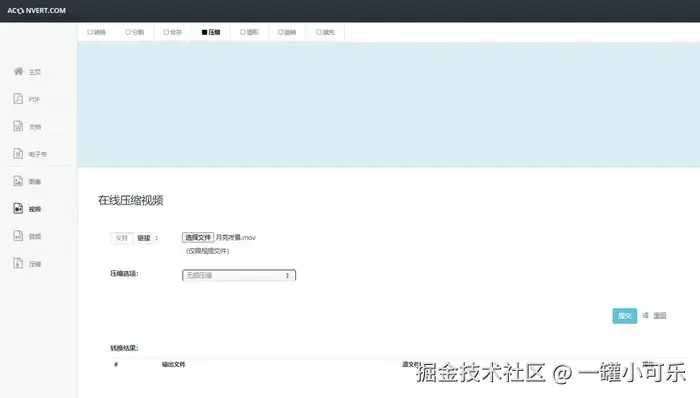 视频如何减少内存?视频文件内存太多会在一定程度上影响其传播速度,我们可以使用在线网站压缩网站压缩视频内存大小。Aconvert是功能较为齐全的视频压缩网站,用户将内存较大的视频上传到该网站上,选择压缩选项后,点击【提交】即可开始压缩视频。