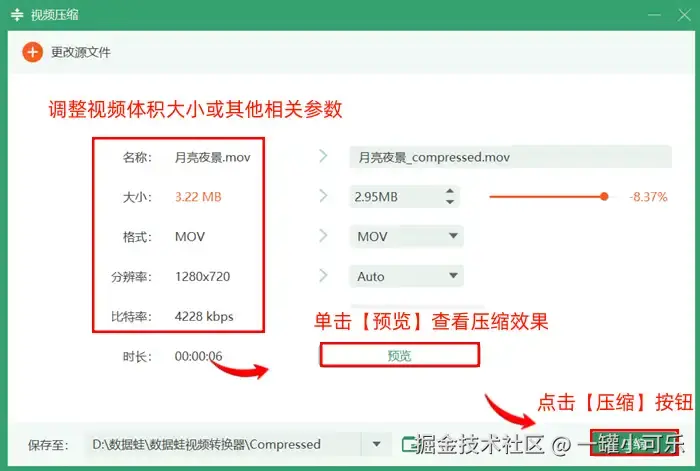 步骤3:调整视频体积大小或其他相关参数,单击【预览】查看压缩效果,确认最终效果后,再点击【压缩】按钮。