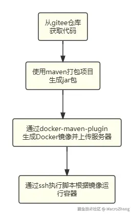 从gitee仓库获取代码->使用maven打包项目->通过插件生成Docker镜像->通过ssh执行脚本运行容器;