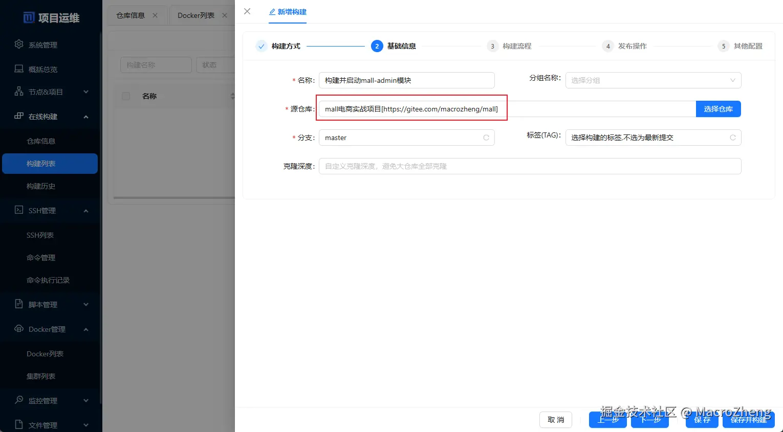 - 接下来配置好需要构建项目的仓库地址,这里使用了mall项目的仓库地址;