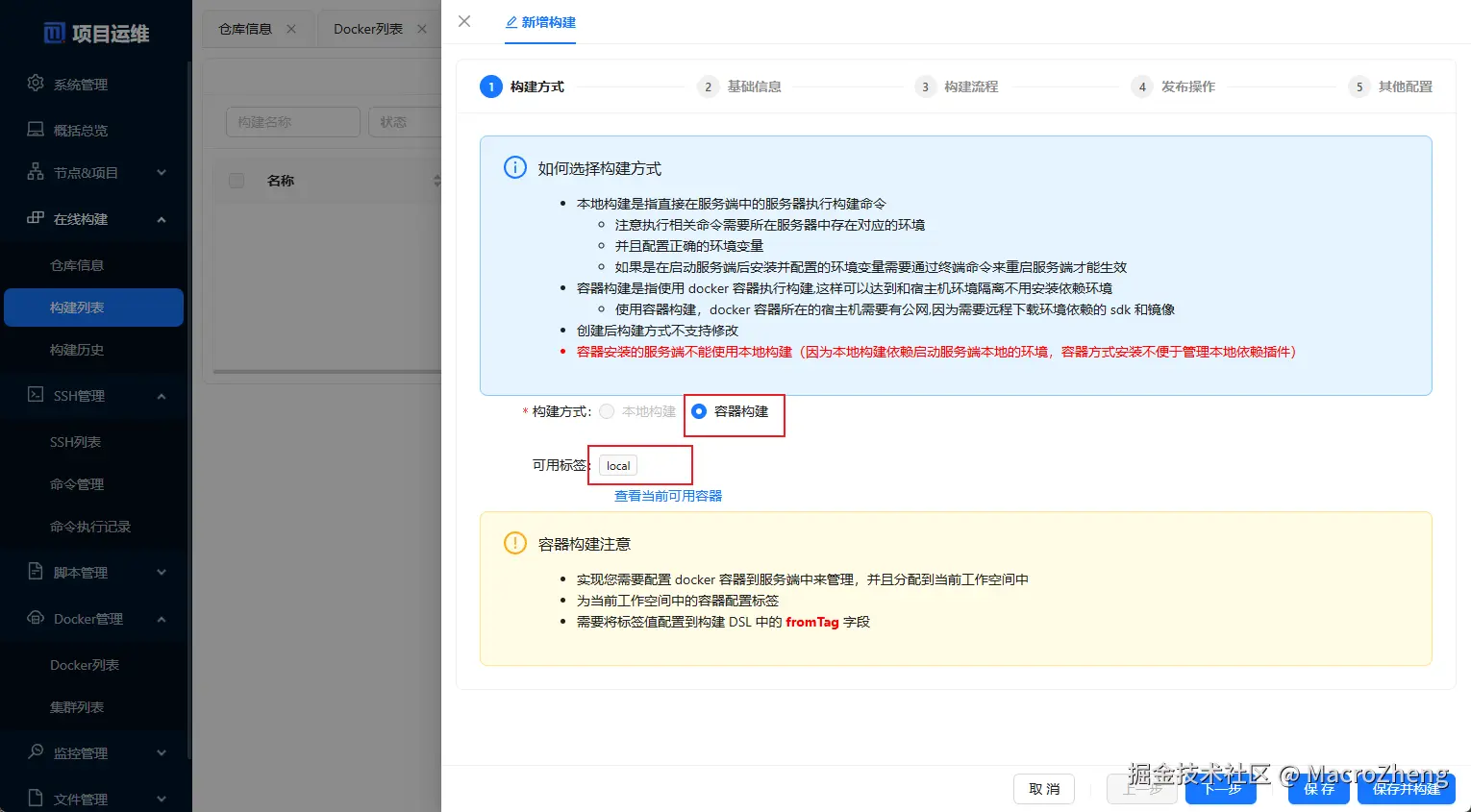 构建列表中新增一个容器构建,注意需要给Docker容器添加local标签;