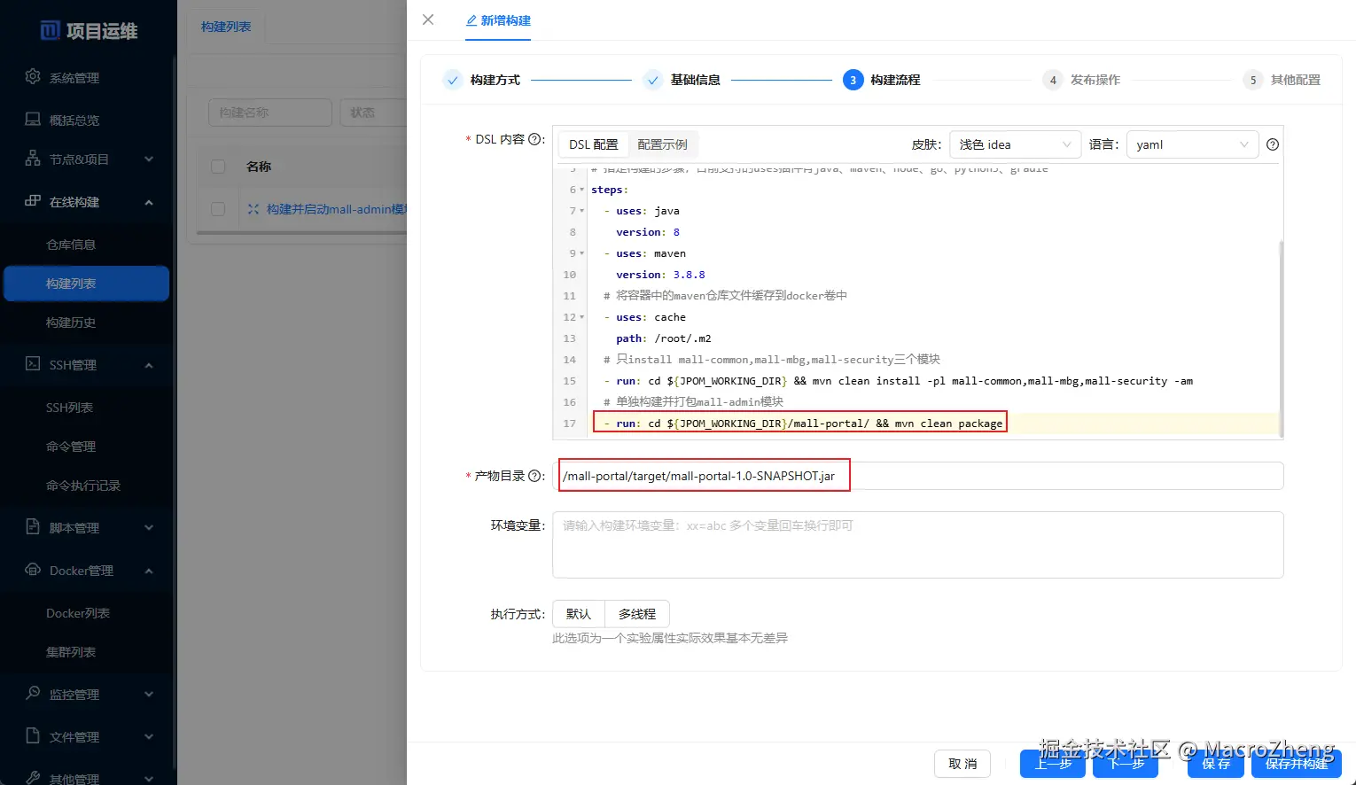构建流程的配置,使用如下脚本进行mall-admin模块的构建,产物目录为/mall-admin/target/mall-admin-1.0-SNAPSHOT.jar;