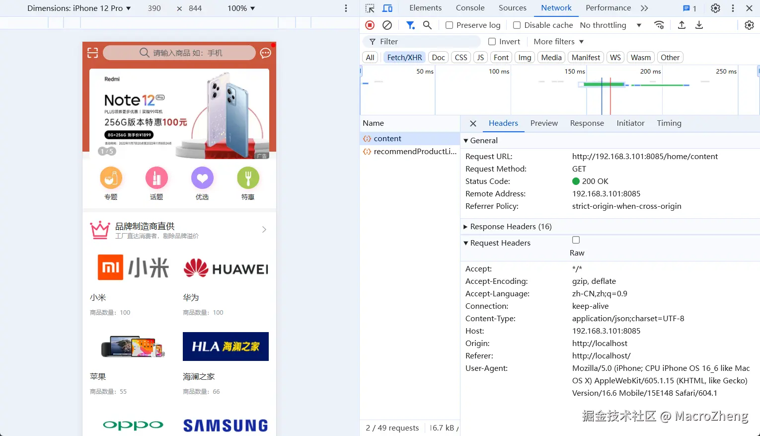 - 然后把前台商城系统的前端运行起来看下效果,使用下功能可以发现后端服务是正常运行的。