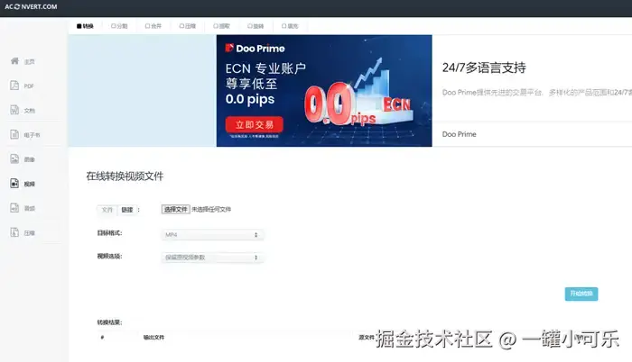 Aconvert是在线文件格式转换、文件压缩网站,该网站支持多种文件格式转换,包括视频、音频、图片、文档、电子书等。用户将文件上传到视频提取音频界面中,即可将视频转换为音频(mp4转为mp3)。