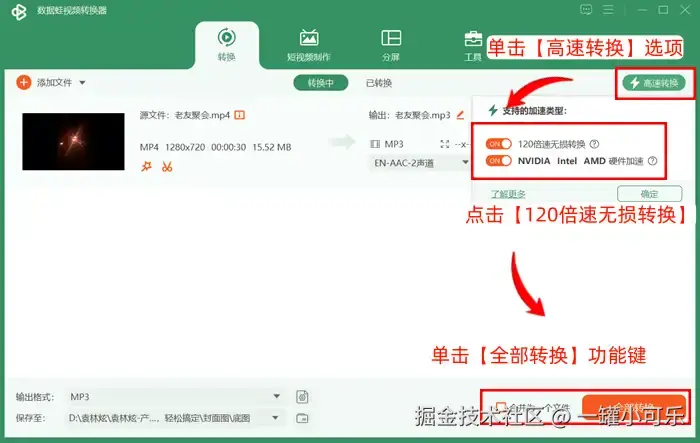 步骤3:返回格式转换界面中,单击【高速转换】选项,点击【120倍速无损转换】开启无损转换功能,然后单击【全部转换】功能键。
