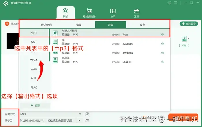 步骤2:选择【输出格式】选项,打开格式选择列表,点击音频格式,选中列表中的【mp3】格式。