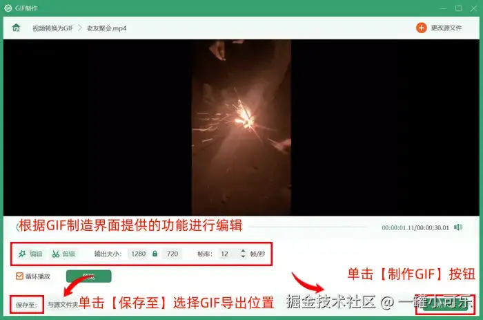 步骤3:根据GIF制造界面提供的功能进行编辑,单击【保存至】选择GIF导出位置,然后单击【制作GIF】按钮,等待制作完成即可。
