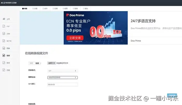 Aconvert是MP4转GIF的网页,用户在该网页上可以选择视频的输出选项(保留原视频参数或更改大小、比特率和帧数率),并选择GIF循环的时长。Aconvert相较于数据 蛙视频转换器来说,可供用户自由编辑的选项较少,GIF输出样式较为单一。