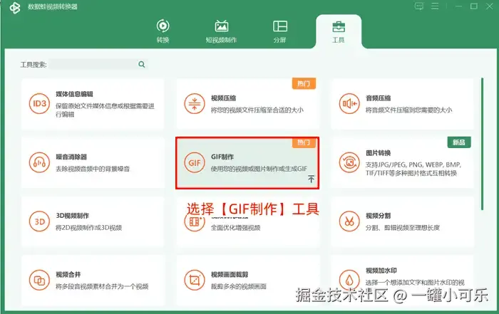 步骤1:双击数据 蛙视频转换器图标进入该应用,打开工具箱界面,选择【GIF制作】工具,点击进入。