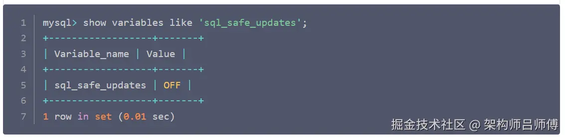 SET sql_safe_updates = 1;命令。 - 将相关设置添加至my.cnf配置文件中的[mysqld]部分。