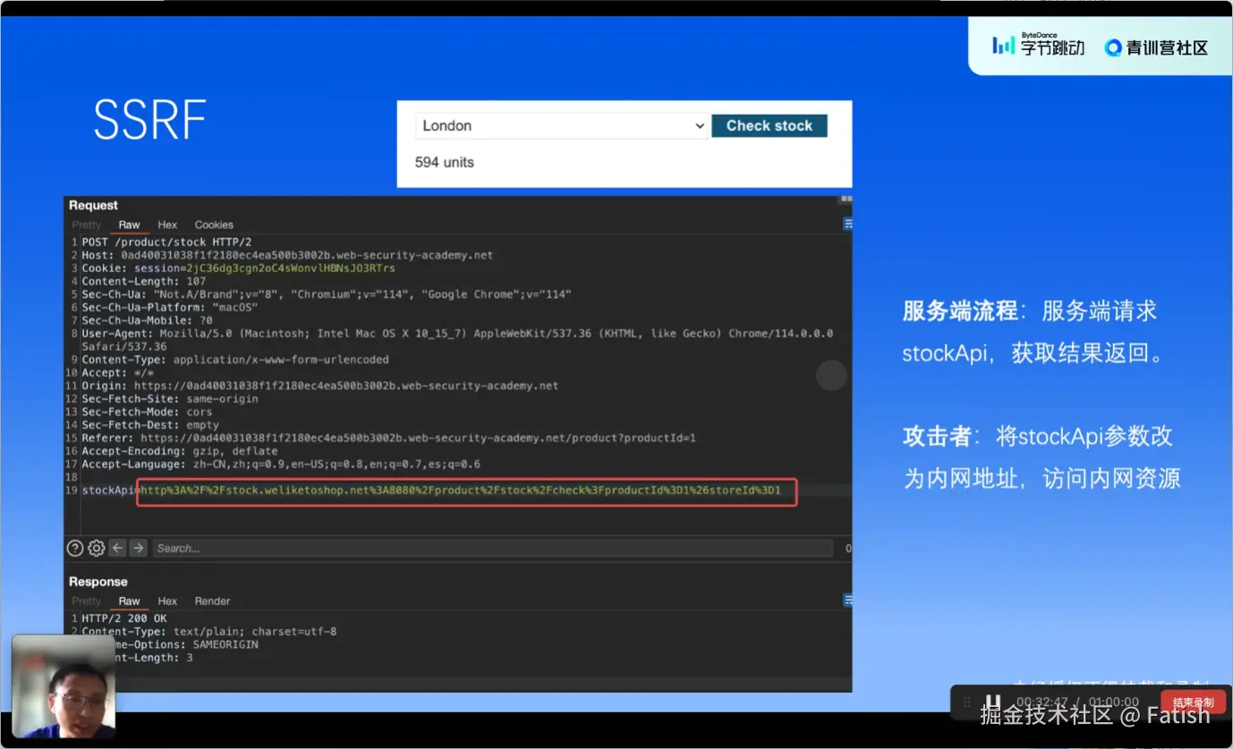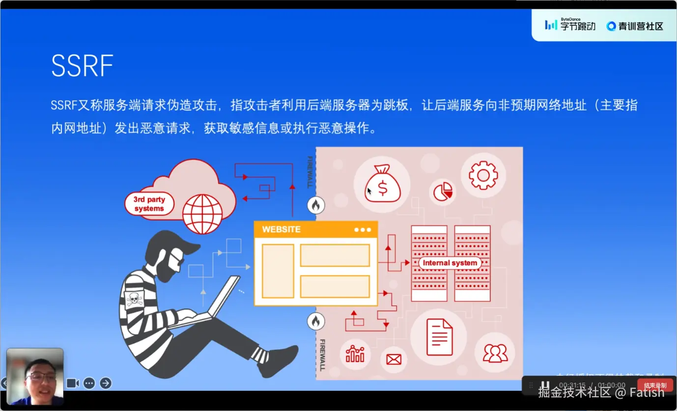 服务器伪造(SSRF)攻击是指攻击者构造一个非预期的网络地址,导致服务器发起恶意请求,执行敏感或恶意操作,进而造成服务器泄露或其他严重后果。例如,在图像下载功能中,攻击者可能通过控制URL参数,让服务器下载并显示恶意图片,甚至可能利用该功能访问内网服务器上的目录,执行删除等破坏性操作。