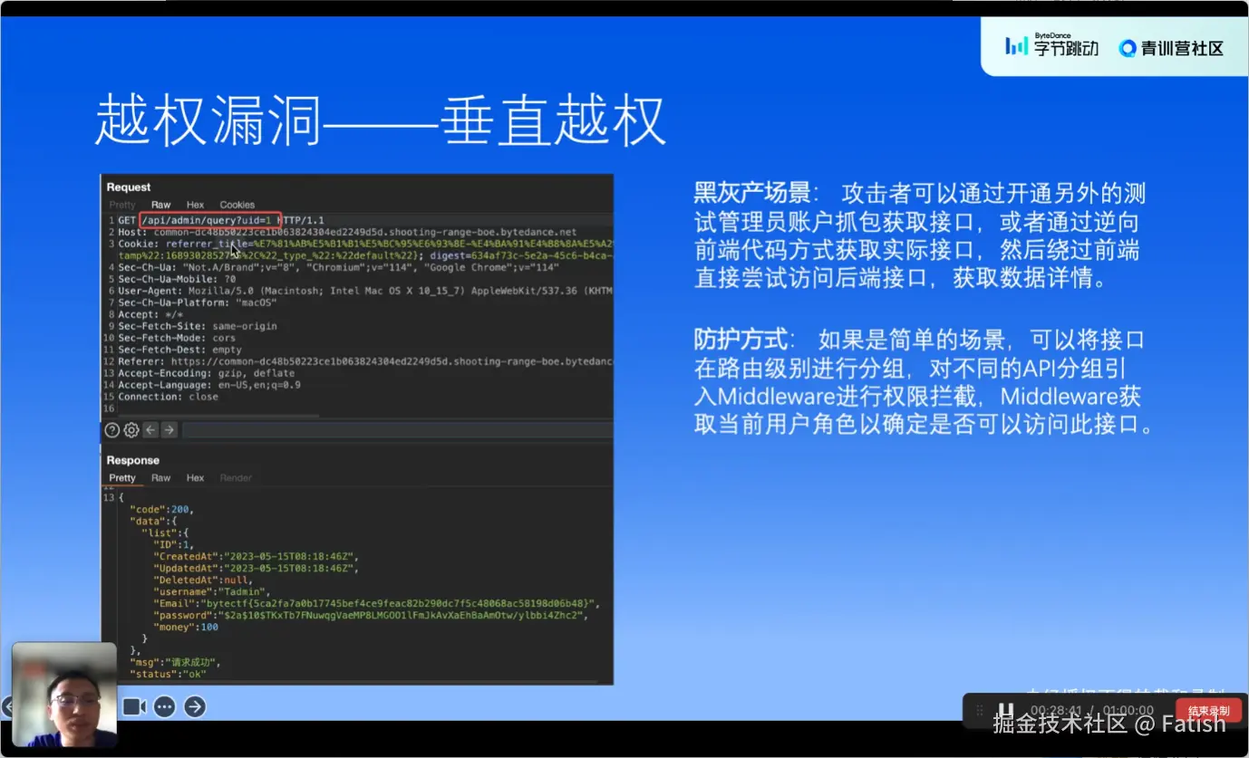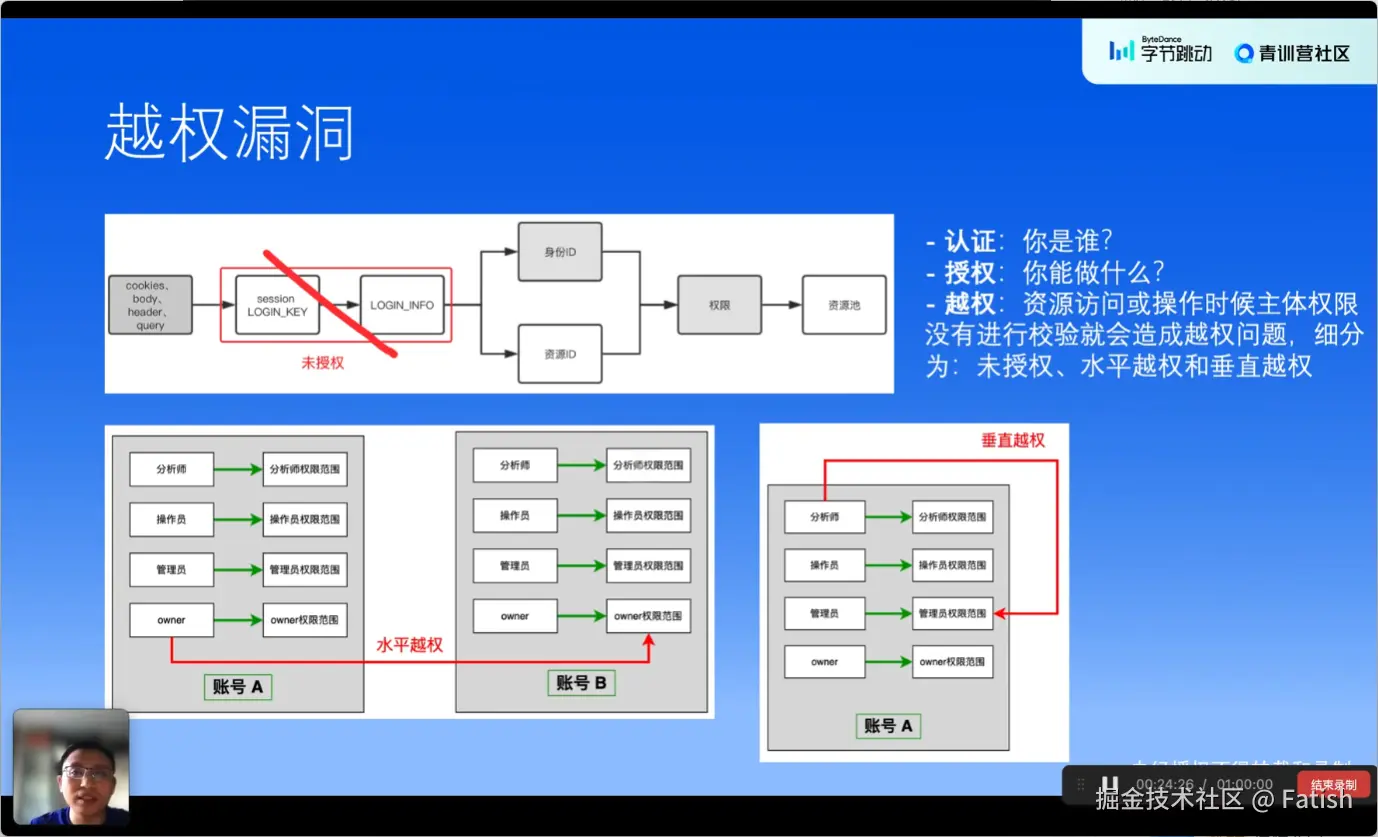 越权漏洞是指用户权限超越了其应有的权限范围,实现不应有的功能操作。越权漏洞主要分为三类:未授权、水平越权和垂直越权。未授权是指系统未进行认证,用户无需凭证即可执行某些操作;水平越权指的是低权限用户能够访问或修改其他用户的账户信息和数据;垂直越权则发生在同一账号内部,即低权限用户通过未做好权限隔离的设计,访问到高权限的数据或执行高权限操作。
