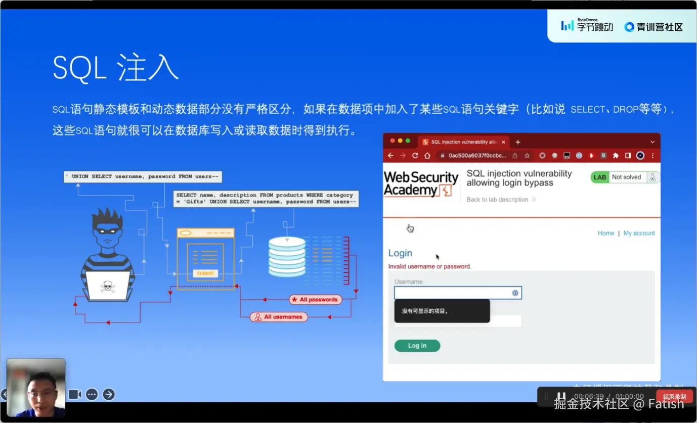 在一个登录功能的例子中,当用户输入错误的用户名和密码时,系统提示错误。但在此过程中,演示了通过在输入的用户名后添加引号闭合并跟两个横杠作为注释符的方式,绕过了登录验证,实现了非法登录。这表明SQL注入漏洞在实际应用中危害较大。