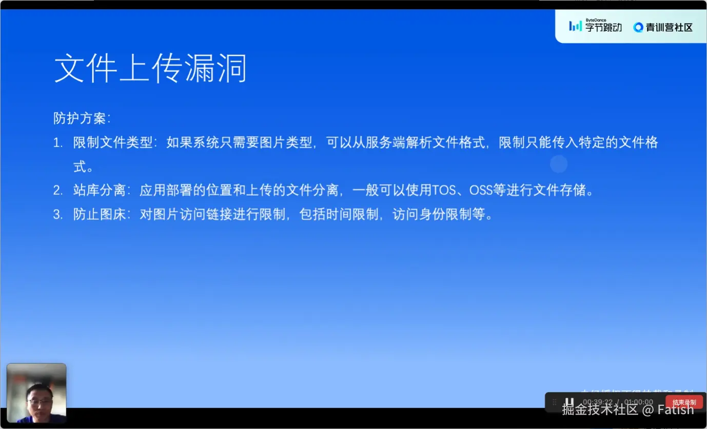 防护文件上传漏洞的方法主要包括两个方面:一是限制上传文件的类型,仅允许上传特定格式的图片或视频音频文件;二是实现账户分离,即将用户上传的文件存储在与网站服务部署位置不同的地方,如CDN或对象存储服务中,这样即使用户上传了不可执行的文件类型,也不会对服务器产生危害。此外,还可以对图片访问链接实施访问控制,如设置登录验证、时间限制以及签名机制,确保链接在有效期内安全有效。