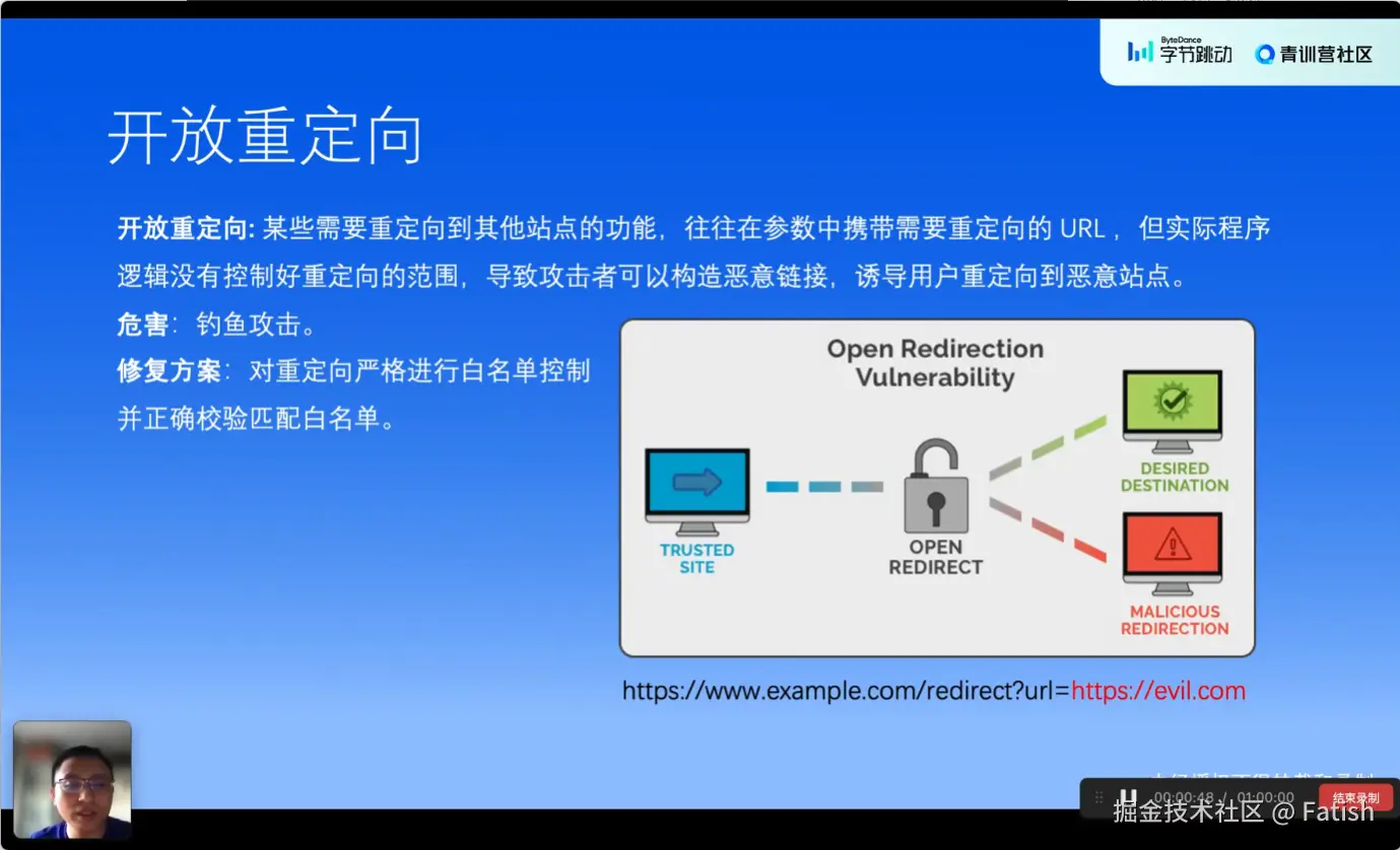 客户端漏洞中的一个典型风险是开放重定向,即在完成用户操作后,页面会跳转到由攻击者控制的外部链接,如果未做好适当限制,可能导致用户被引导至恶意站点,引发钓鱼攻击或信息盗取。防范措施是为重定向链接设置白名单策略,只允许跳转至站内导航或预设的服务范围内的链接。