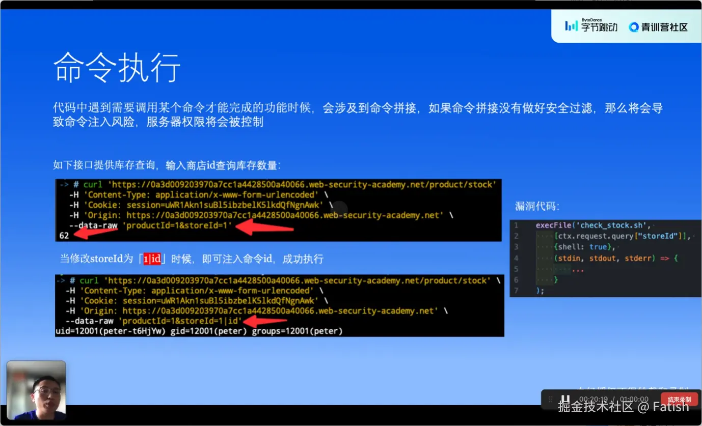 命令注入漏洞是指攻击者通过向命令参数字段输入恶意值,从而执行非预期的命令。例如,在一个库存查询接口中,攻击者可能通过修改传入的ID参数,除了查询库存外,还可能执行其他系统命令,如获取当前用户信息或删除操作。预防命令注入漏洞的方法包括对动态传入的值设置白名单,只允许特定的、预定义的参数通过;进行数据类型的校验,确保传入的数据符合预期类型,例如在本例中检查ID是否为整型;在无法确定白名单的情况下,采用黑名单方式过滤可能会引发命令注入风险的字符串或字符;以及对所有参数进行转译处理,确保其在执行时是安全的。