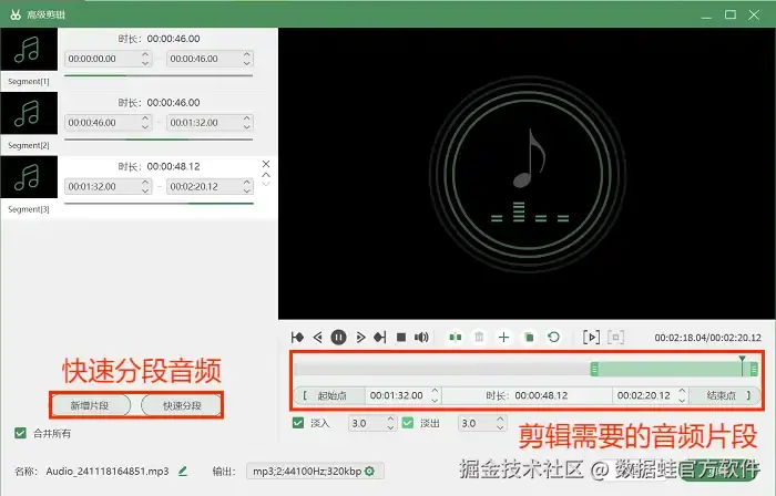 步骤3: 录制结束后,可以选择进入 “高级剪辑” 页面,在这里你可以剪辑需要的音频片段,增加音频特效,还可以自由调整录音格式、采样率等。