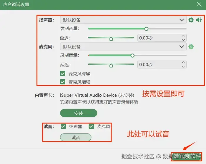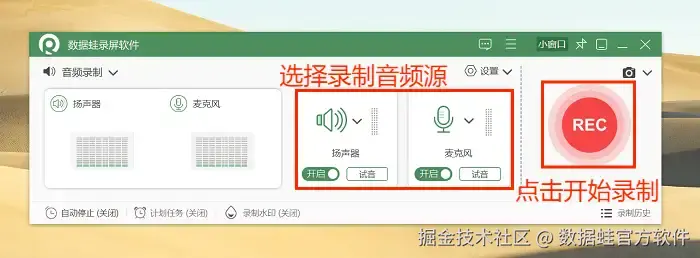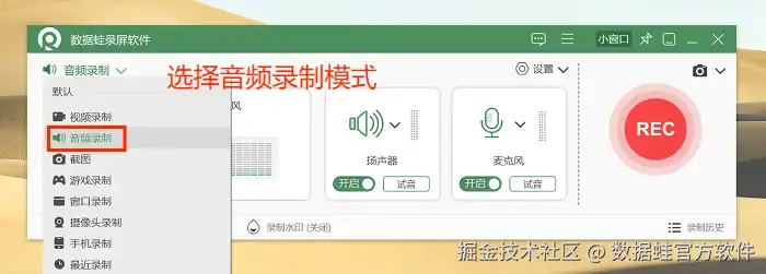 步骤2: 选择合适的音频源,想录内部声音还是外部声音?点击相应的按钮就行,比如 “扬声器” 是内部声音, “麦克风” 是外部声音。如果有需要,我们还可以进入 “声音调试设置” ,调整录音的音量,开启麦克风增强和降噪功能。设置完毕后,点击 “REC” 按钮,录音开始。