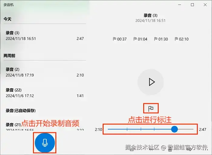 步骤2: 点击录音图标(一个类似于麦克风的图标),一切声音都会被它悄悄捕捉。在录音的过程中,还可以使用标注工具对音频进行实时标注哦!录音完成后,它会弹出界面显示录音文件,点击三角符号就能试听。