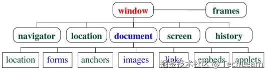 - BOM:Browser Object Model(浏览器对象模型),描述处理网页内容的方法和接口。JS 操作浏览器部分功能的 API。通过 BOM 可以操作浏览器窗口,比如弹框、控制浏览器跳转、获取浏览器分辨率等等。
