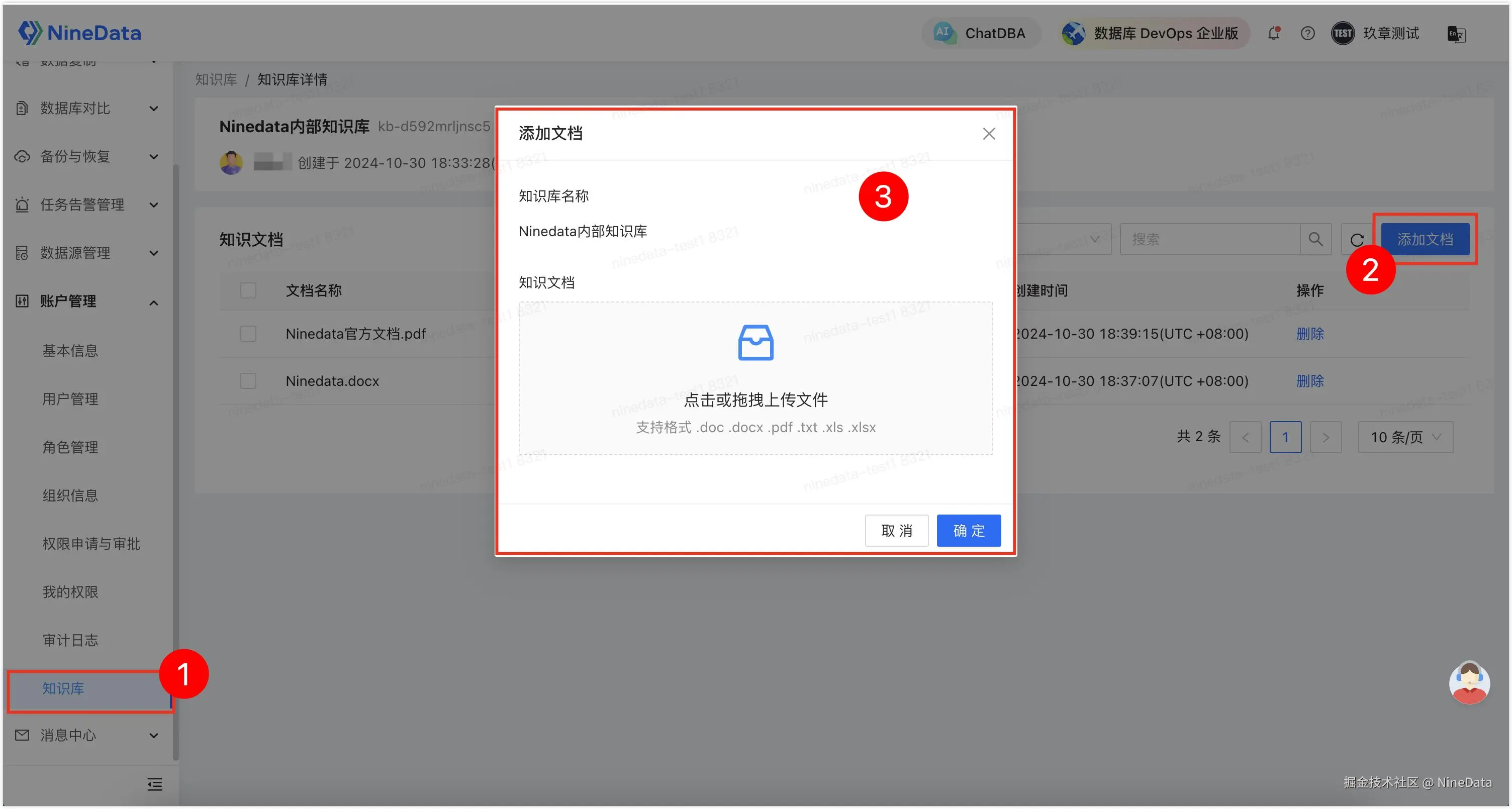 针对这个短板,NineData 为 ChatDBA 产品进行了重大升级,其可以支持对接企业自有的知识库,进一步增强私域数据的高效、精准问答能力。
