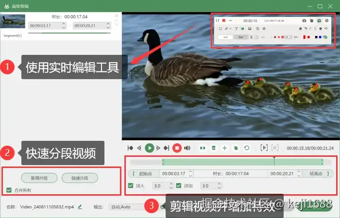 步骤3:录制过程中,可以使用工具箱里的工具对视频进行实时的标注、编辑等功能。录制结束时,视频会自动弹出预览,你还可以使用软件内置的编辑器对视频进行剪辑和保存。
