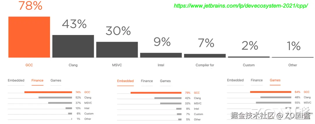 在 2021 年 jetbrains 开发者调查中表示 GCC 编译器拥有 78%的用户使用率,Clang 编译器有 43% 的用户使用率。