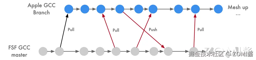 在早期的 Apple MAC 电脑选择使用 GNU 编译器集合(GCC)作为官方编译器。尽管 GCC 在开源世界中表现良好,但苹果对编译工具提出了更高要求。苹果在增强 Objective-C 和 C 语言方面投入了大量努力,但 GCC 开发者对苹果在 Objective-C 支持方面的努力表示不满。因此,苹果基于 GCC 分为两个分支进行独立开发,导致苹果的编译器版本明显落后于官方 GCC 版本。