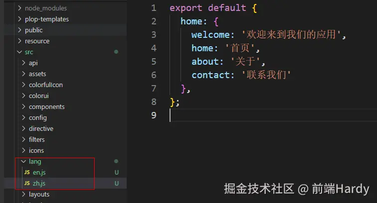 首先,我们需要创建语言资源文件来存储中英双语的文本内容。在项目的 src 目录下,新建一个 lang 文件夹。在这个文件夹中,分别创建 en.js(英语资源文件)和 zh.js(中文资源文件)。