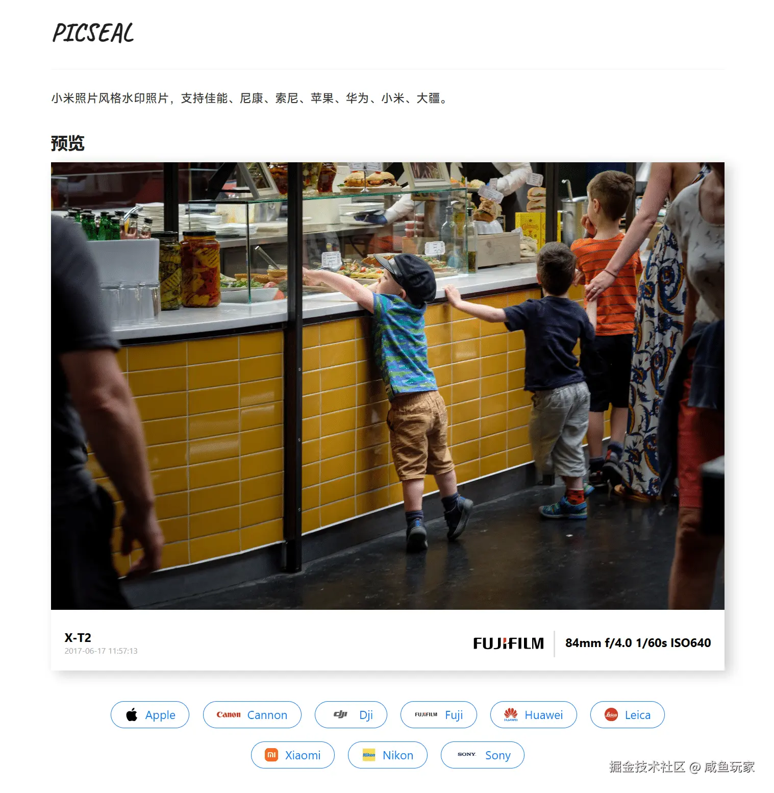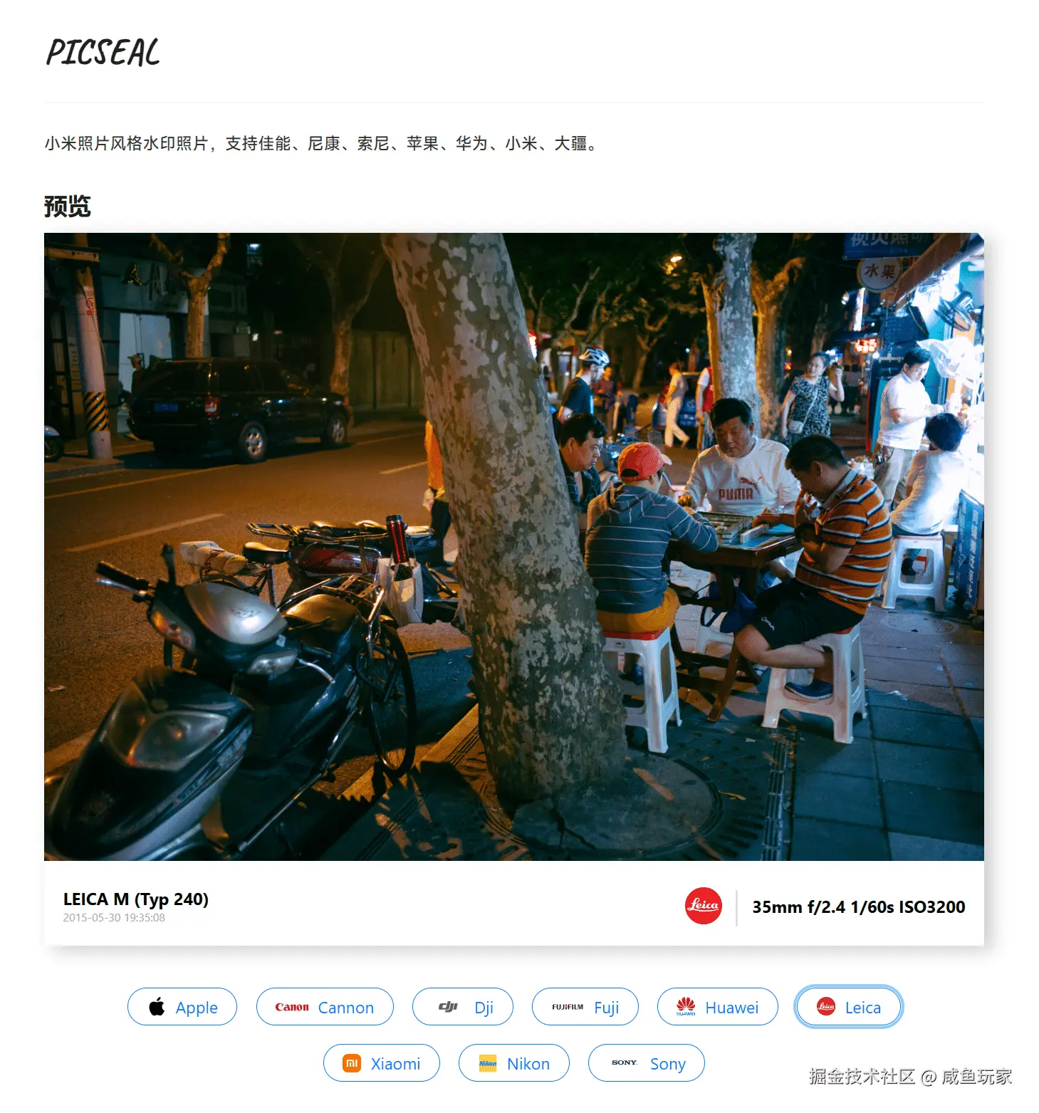 想要给我的照片加上小米徕卡水印,但是小米手机只能给小米拍的加水印,于是我在网上找工具,发现有一个很好的安卓应用,订阅费要 30 块一个月。放弃,又看到了一个 Python 写的命令行工具 leslievan/semi-utils,感觉使用不太友好,没有 GUI 不适合新手,一开始想着给它加个 QT 的界面,后来想想开发成本太高,也不大看好 PyQT 开发图形,更偏向前端来开发这些产品。