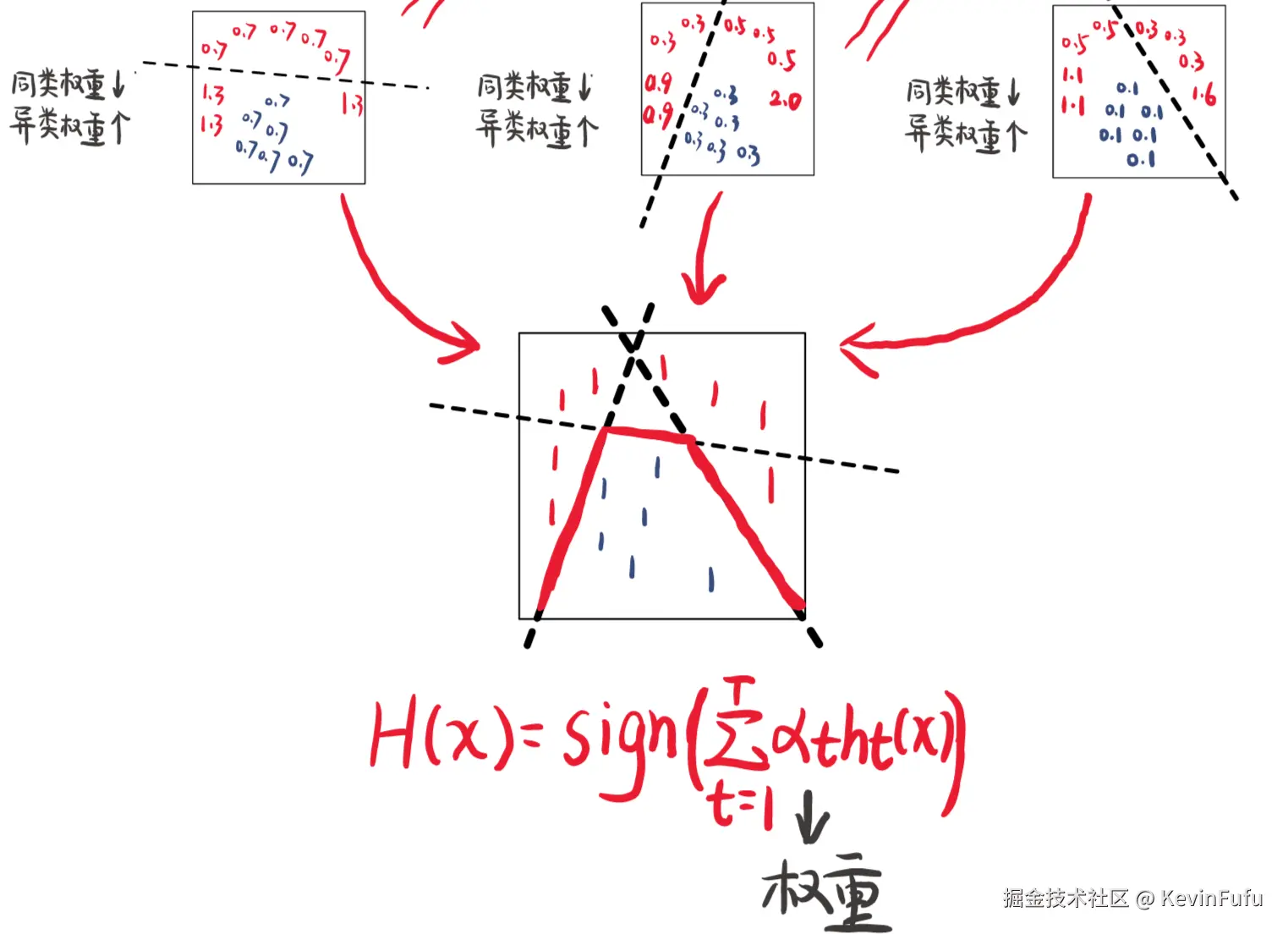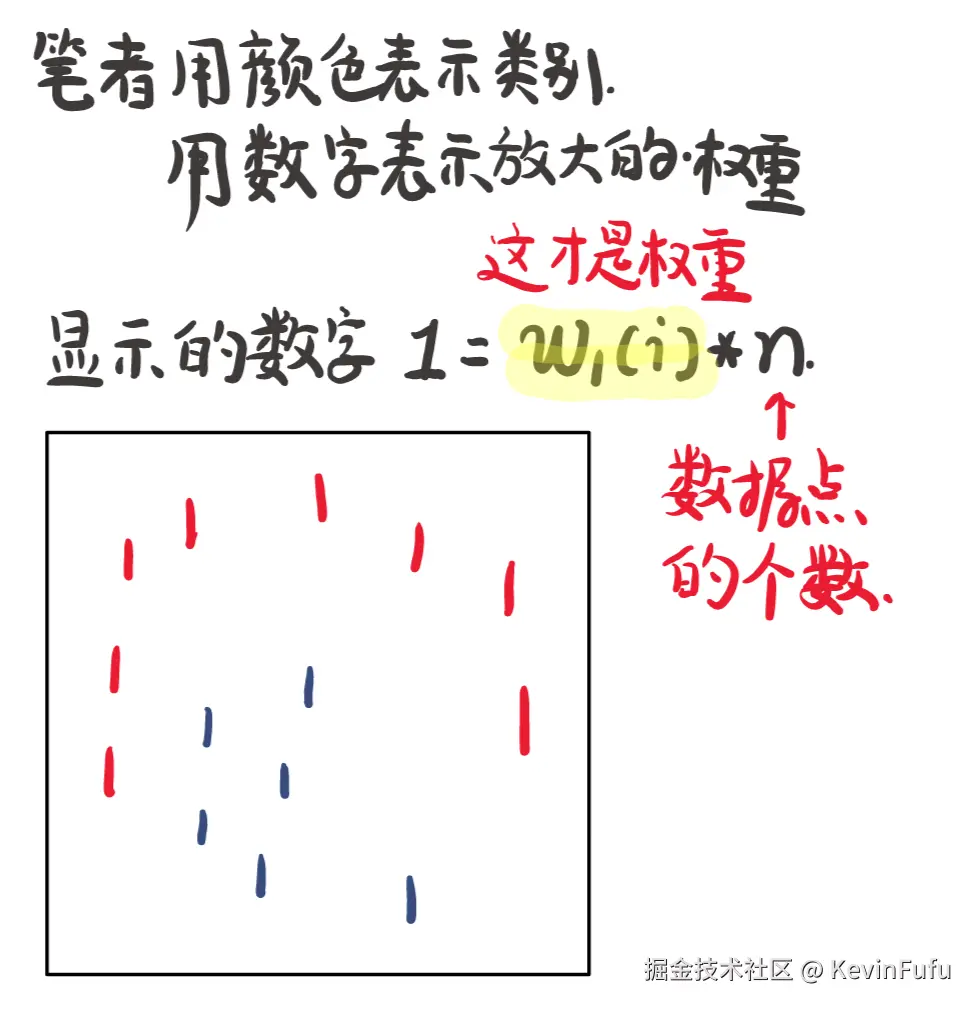 更高的权重将会被分配到未准确分类的点、更低的权重将会被分配到已准确分类的点