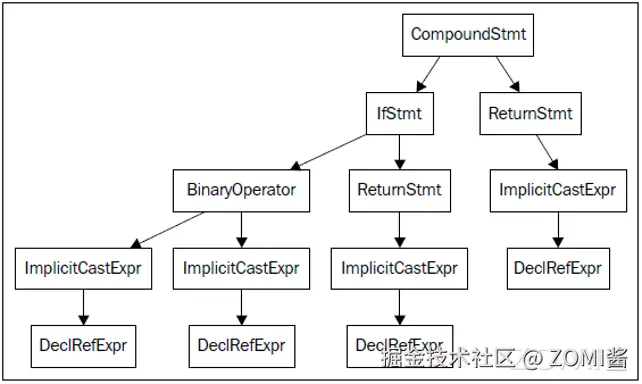 AST 节点 CompoundStmt 包含 if 和 return 语句,IfStmt 和 ReturnStmt。每次对 a 和 b 的使用都生成一个到 int 类型的 ImplicitCastExpr,如 C 标准的要求。