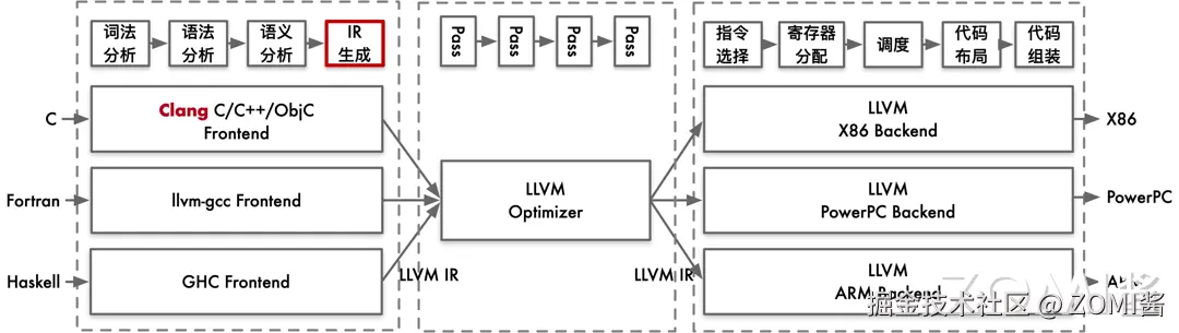 这个阶段属于代码生成之前的过程,和硬件与目标无关,所以在前端的最后一个环节是 IR 的生成