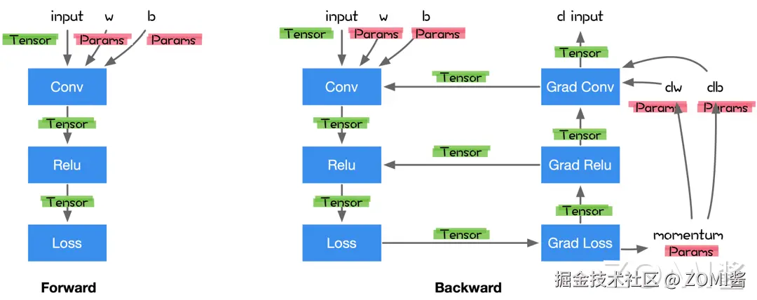 目前主流的 AI 框架,在后端会将前端编程语言(例如 Python)构建的网络模型前向与反向的梯度计算以计算图的形式来表示。